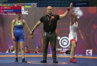 Der Moment des Triumphs bei der Kadetten EM in Faenza! Svenja Jungo bezwingt ihre starke Gegnerin aus Weissrussland durch Schultersieg. Zuvor hatte sie sich durch geschickte Kampftaktik, konsequent zuendegebrachte Angriffe und eine ausgezeichnete Defensive bereits einen 6:2 Punktevorsprung erkämpft. Ab dem späten Nachmittag (Beginn: 17.30) kämpft Svenja dann um die EM-Medaillen mit. Im Halbfinal wartet zunächst Daryna Matsola aus der Ukraine.